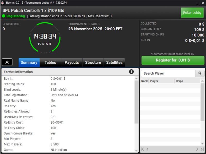 Улучшенный приз делает сегодняшний центролл особенно привлекательным и ценным для игроков-любителей. Представьте себе, кто-то, заплатив всего 1 цент абсолютно точно поучаствует в турнире с призовым 7,000$ и получит шанс отобраться на игру финального стола серии BPL, которая пройдет в Таллине 5 декабря и побороться там за дополнительные призы!