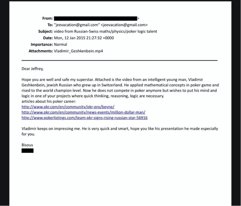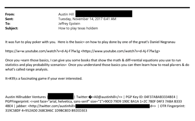 Согласно обзорам покерных СМИ, речь идет о частной переписке, где обсуждался покер и возможность обучения игре. Эпштейну рекомендовали освоить базовые принципы покера по одному из видео Даниэля Негреану.